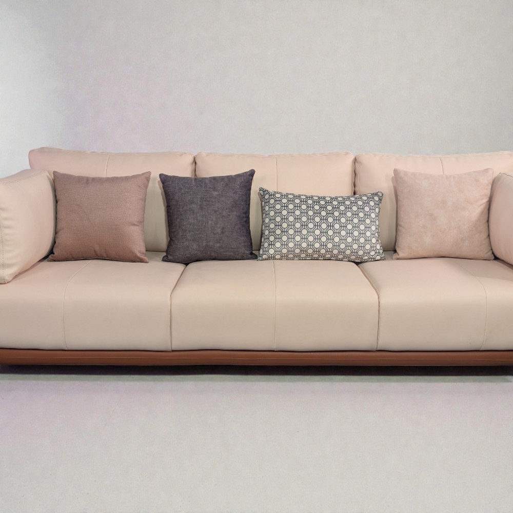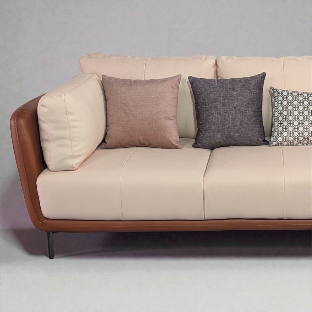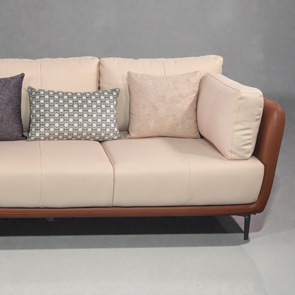 Contemporary Beige & Brown Leather Sofa – 3-Seater with Decorative Cushions. Add warmth and elegance to your space with this modern 3-seater sofa featuring a beige upholstered seat and backrest, beautifully contrasted by brown leather sides and armrests. Designed with clean lines and slim dark legs, it blends comfort with contemporary style. Includes five decorative throw pillows in neutral tones, perfect for living rooms, offices, or reception areas.
